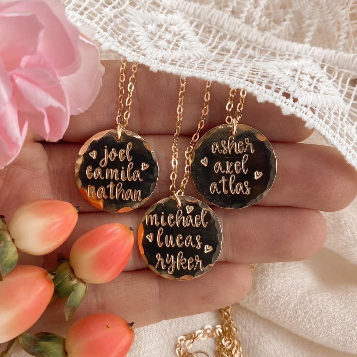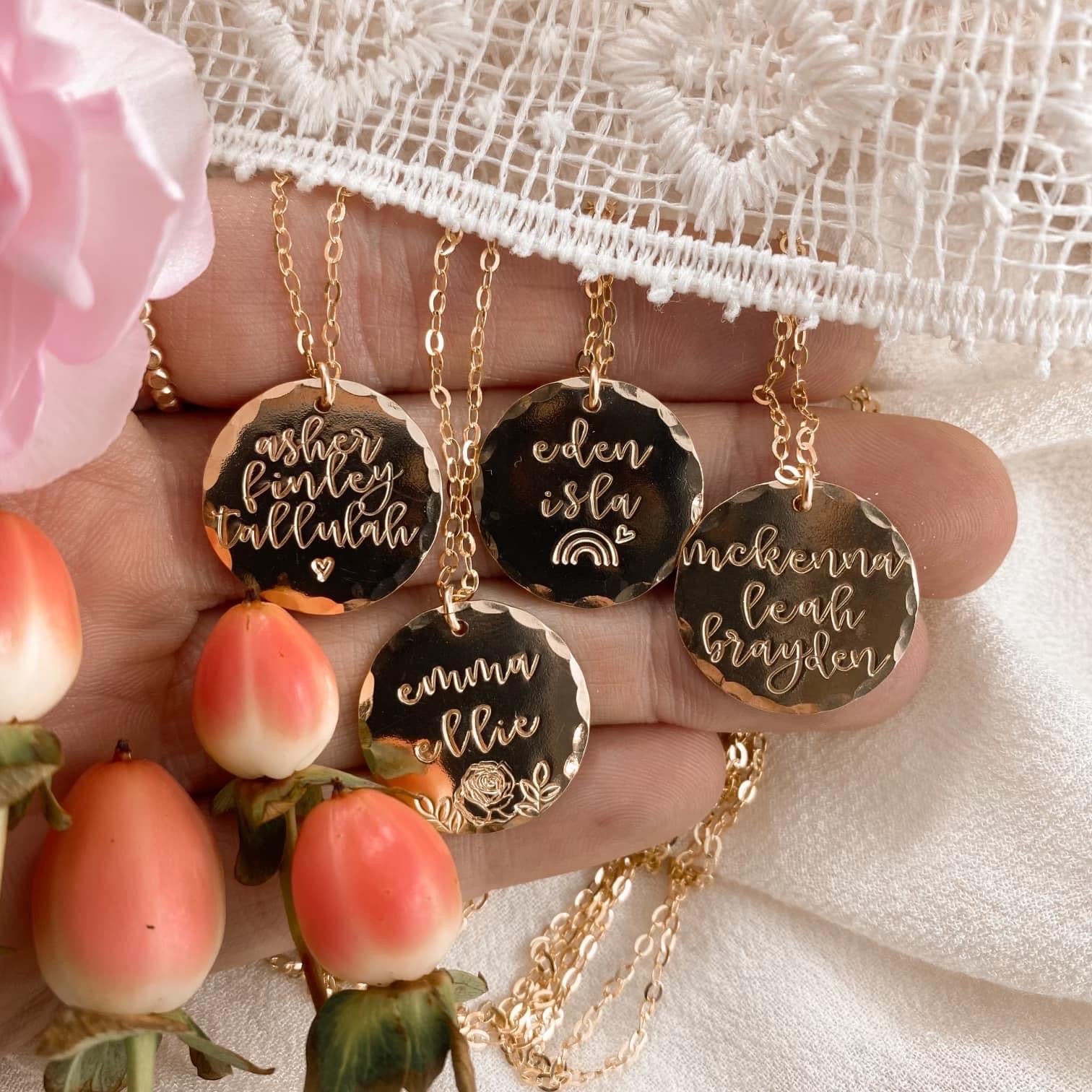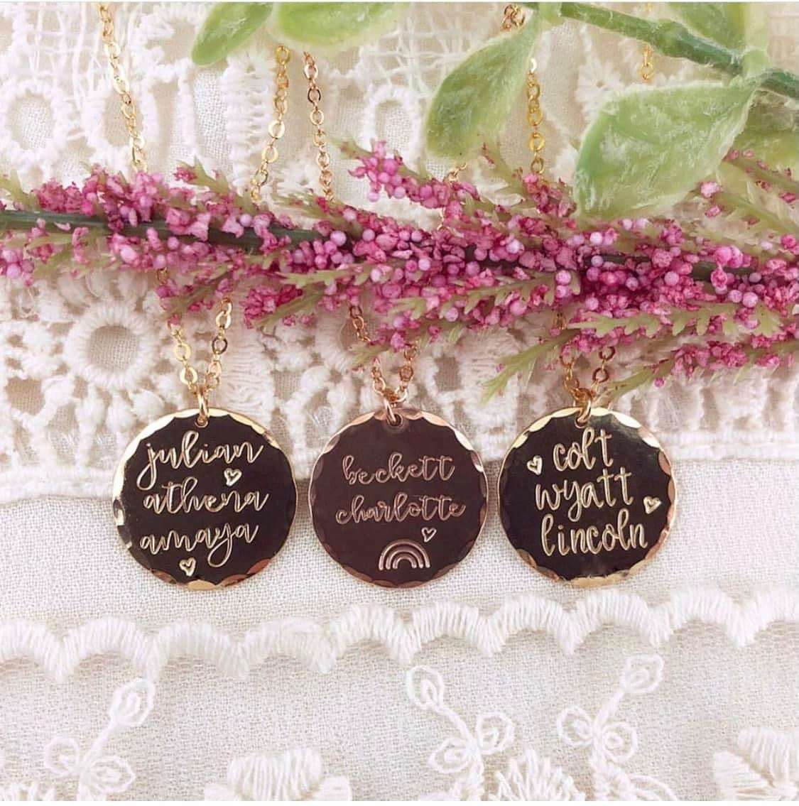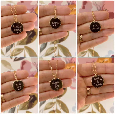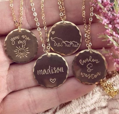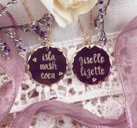 These discs can fit a date, names, initials, a short quote, or birth month flower.