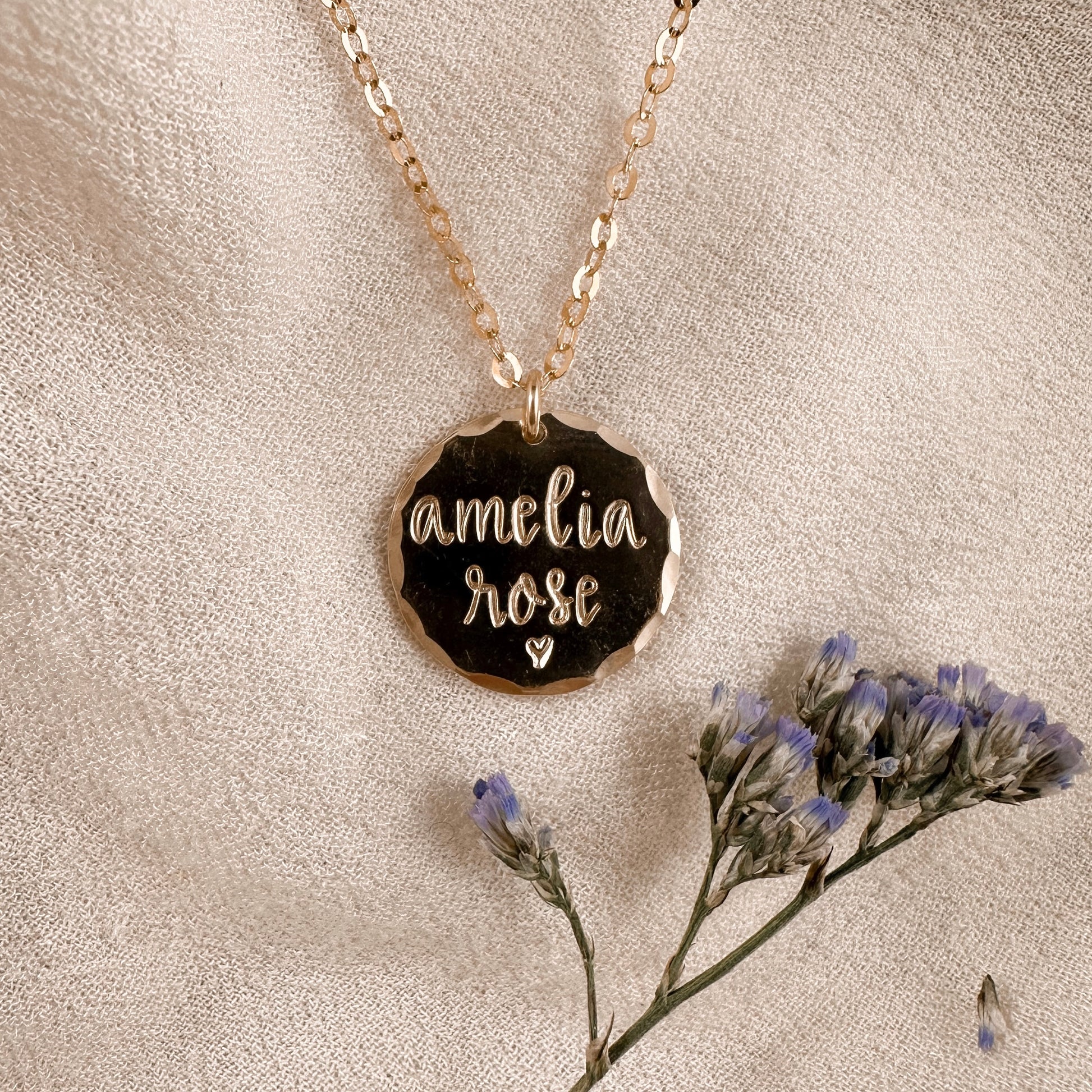 Disc can hold up to 6 characters in regular lily font or Whimsy, or 7 characters in tiny lily across the middle on one or two lines