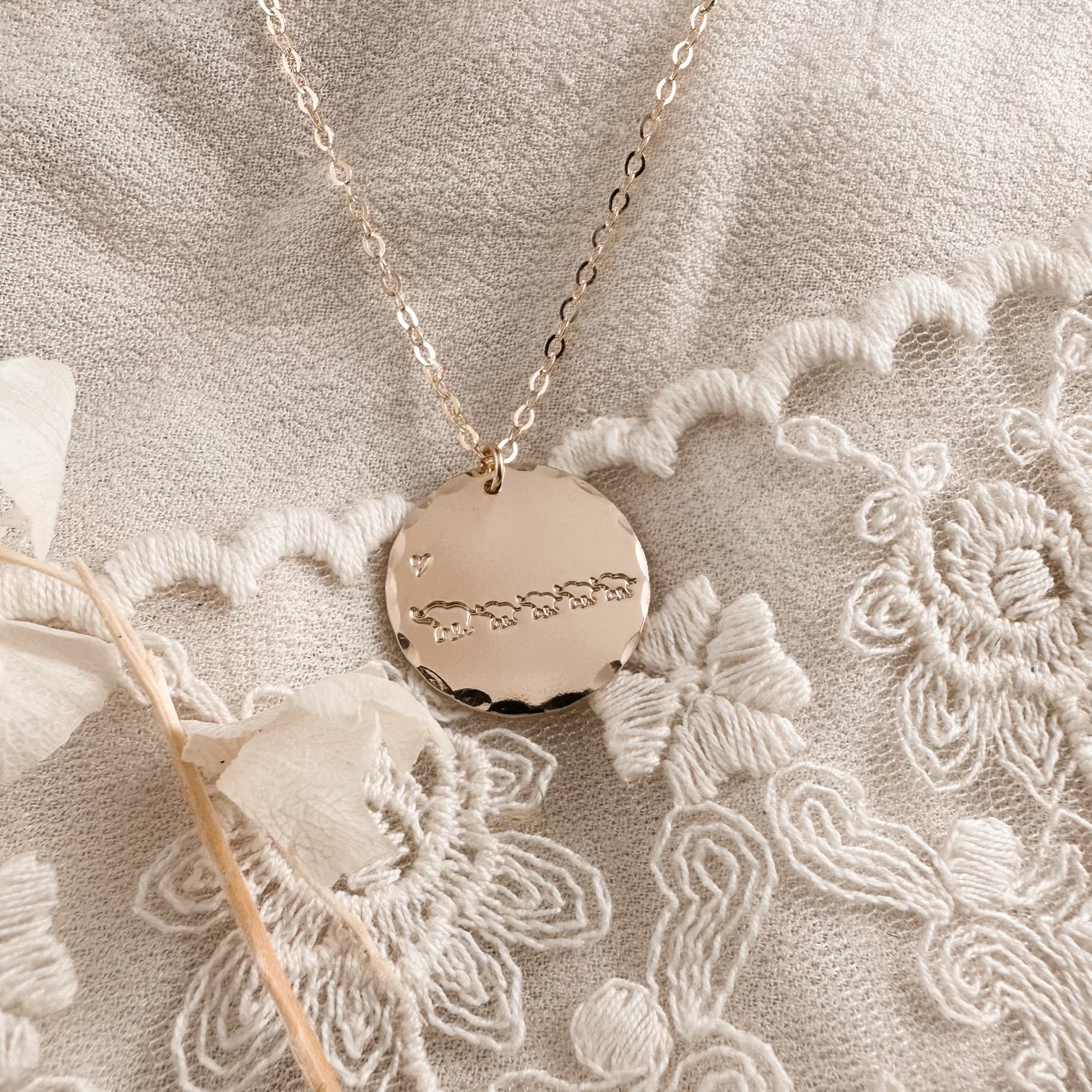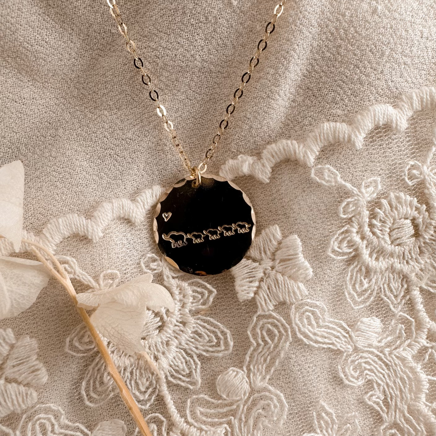 Ellie and 4 babies on a 3/4" (Aura) 14K Gold Filled disc.