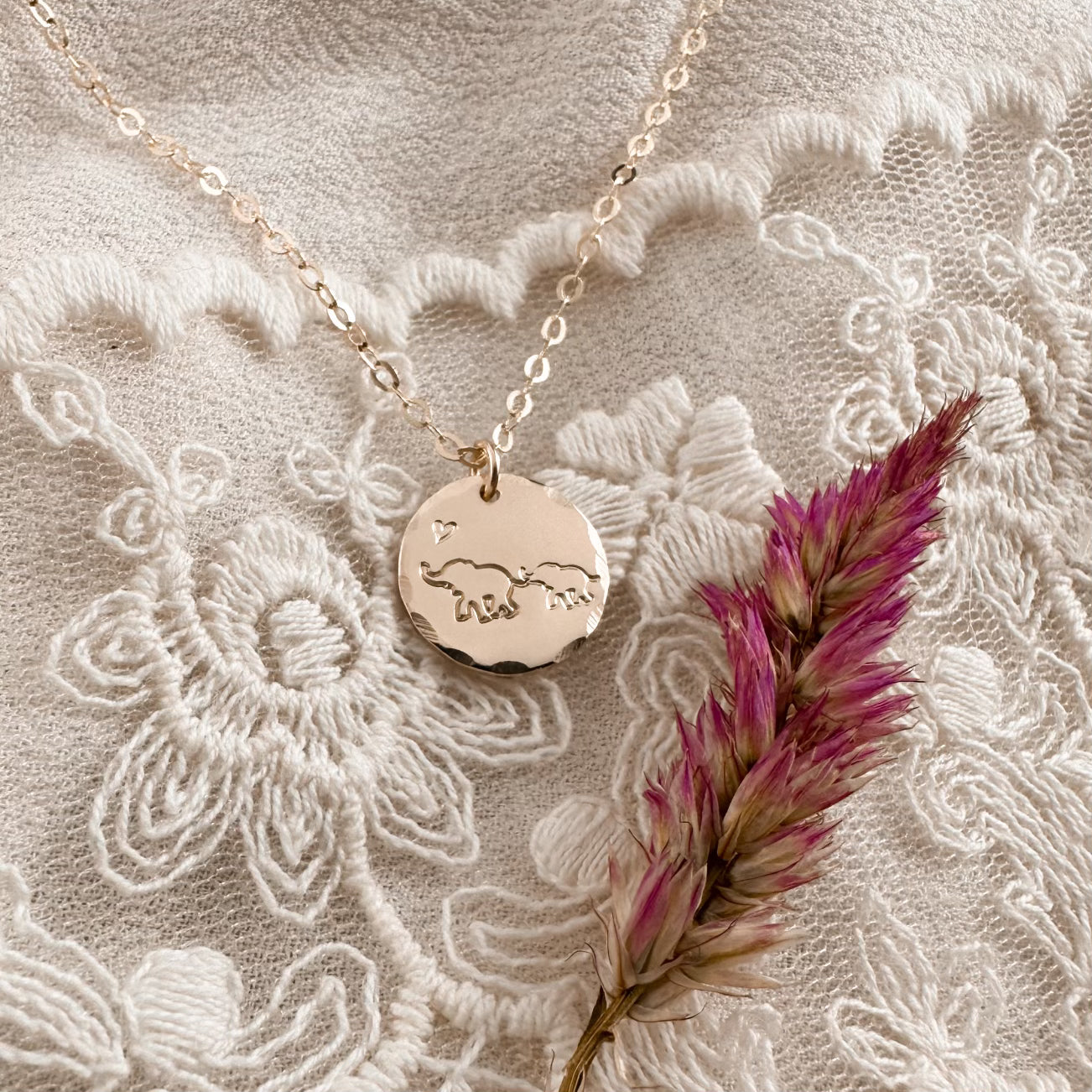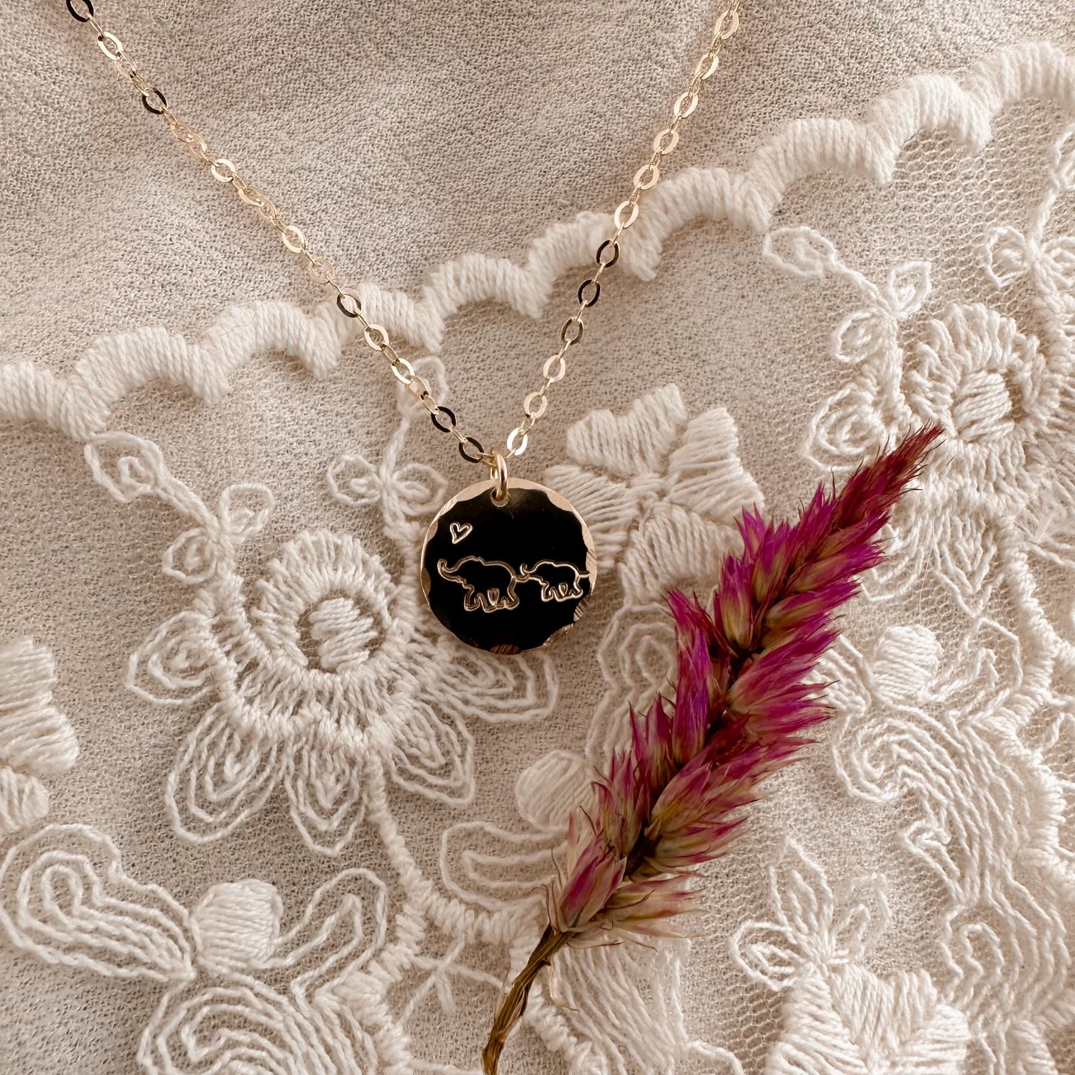 Ellie + 1 baby comes hand stamped on a 1/2" 14k gold filled disc attached to a 14k gold filled chain.