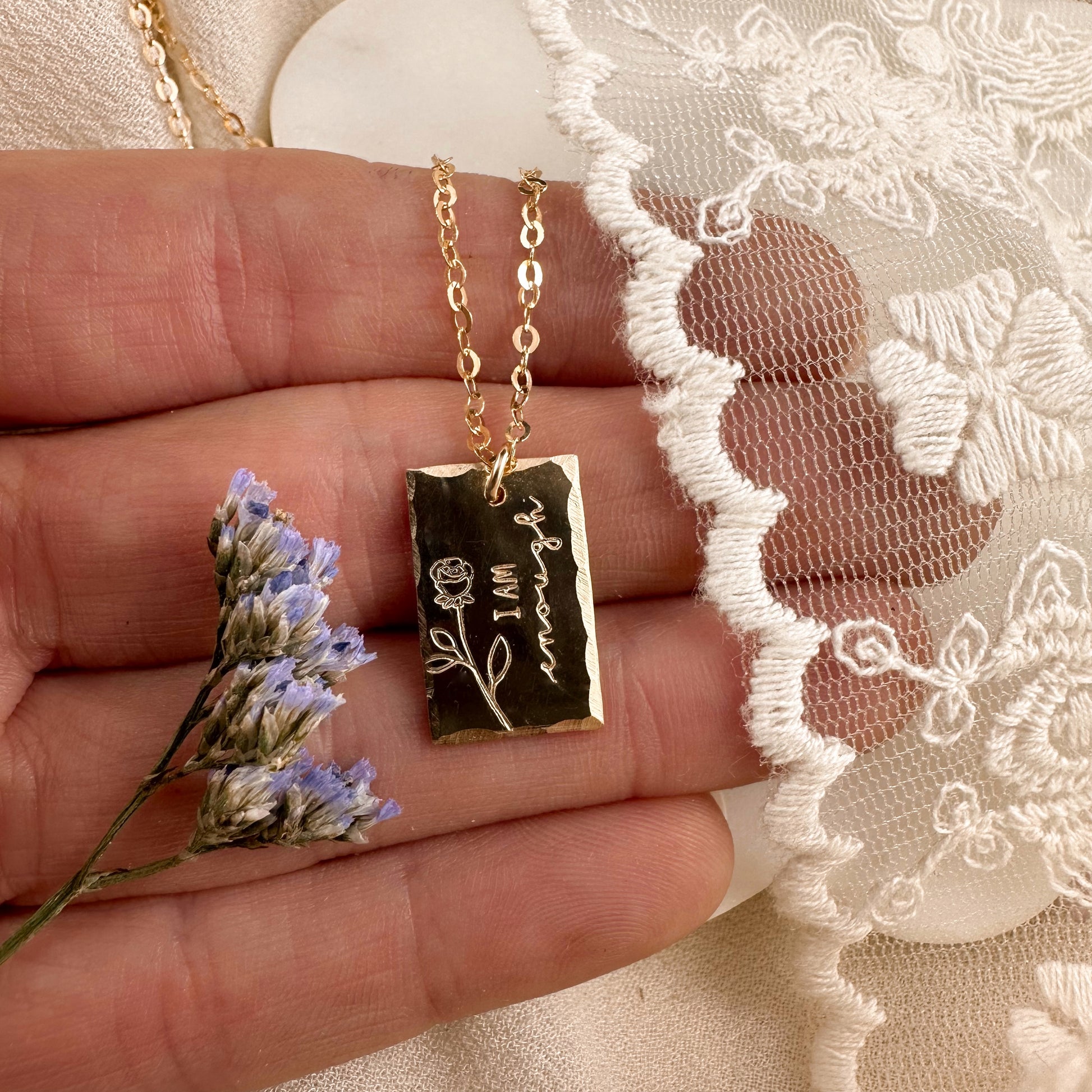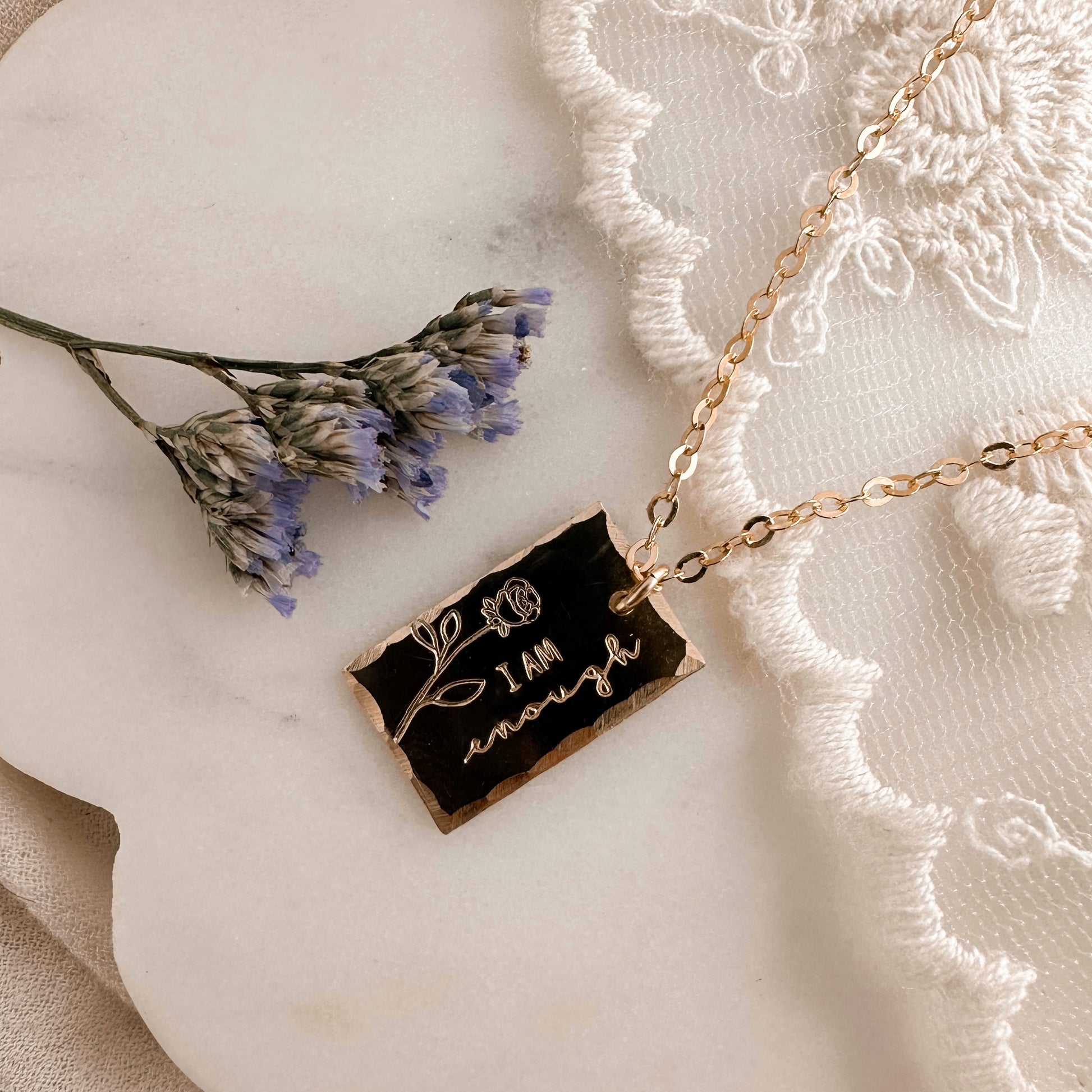 'I am enough' stamped beside a long stem rose with hammered edges