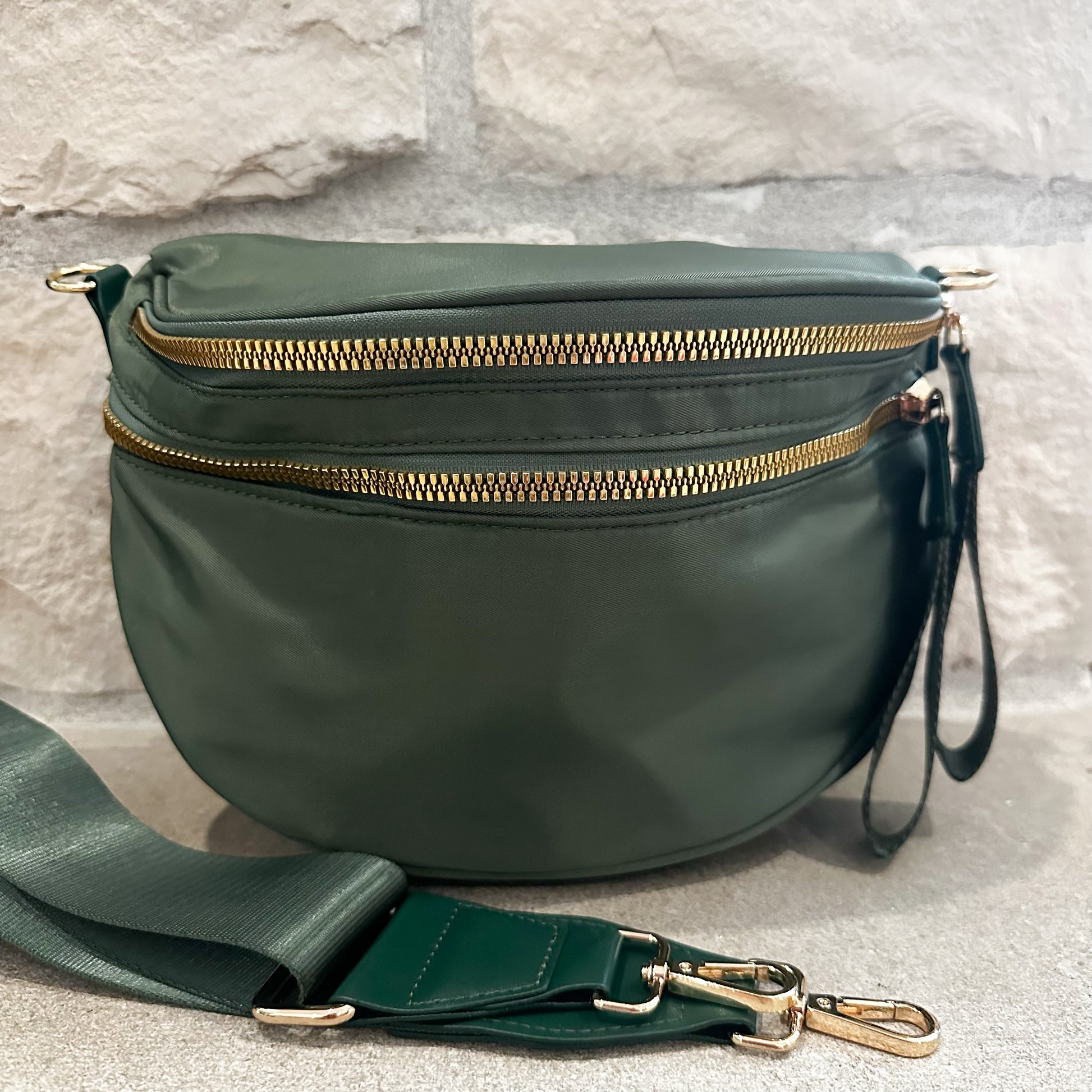 The bag includes two spacious compartments with double zippers, accented by large, distinctive zipper pulls. The wide 2-inch strap ensures comfort, even during long hours of wear—making it perfect for shopping trips and everyday outings.