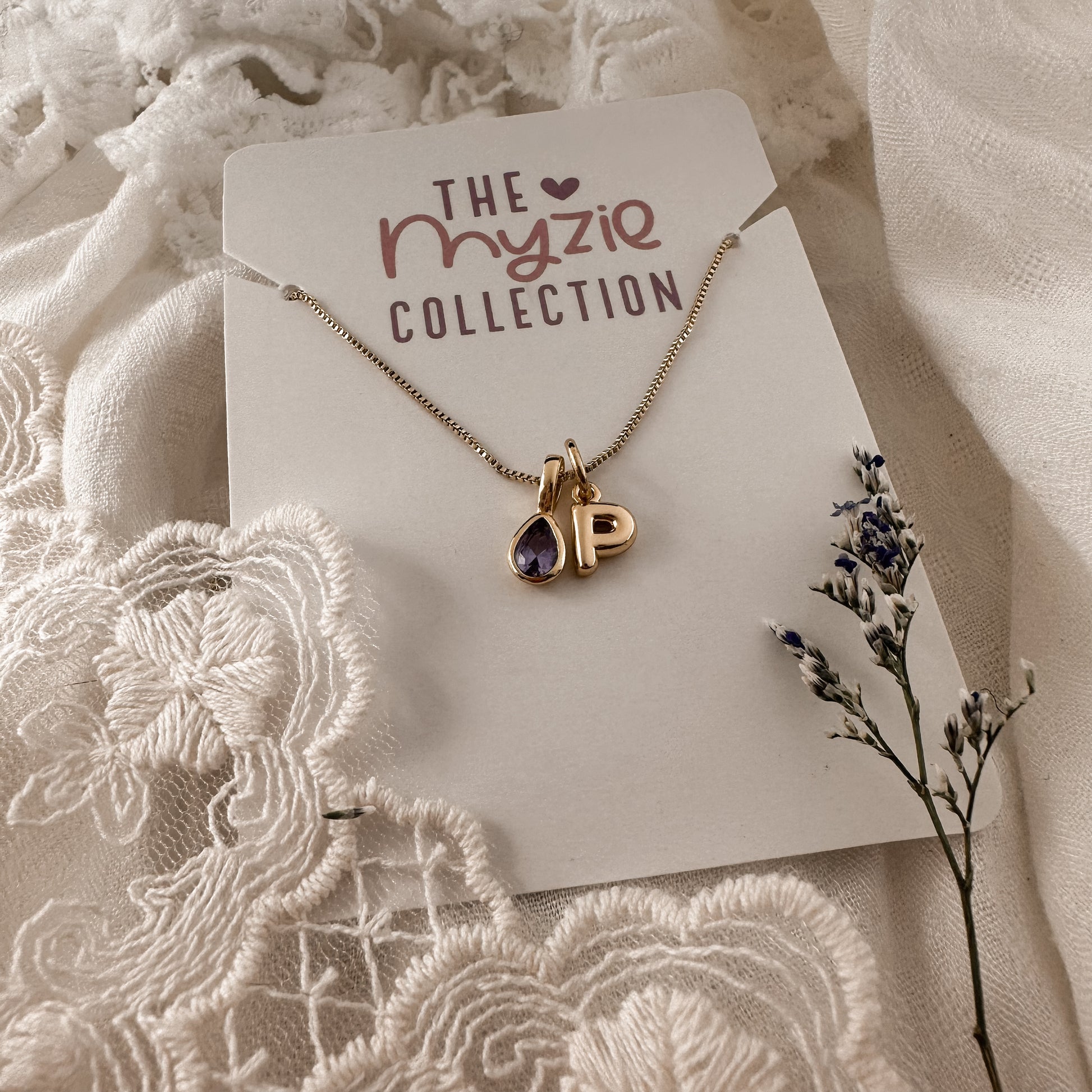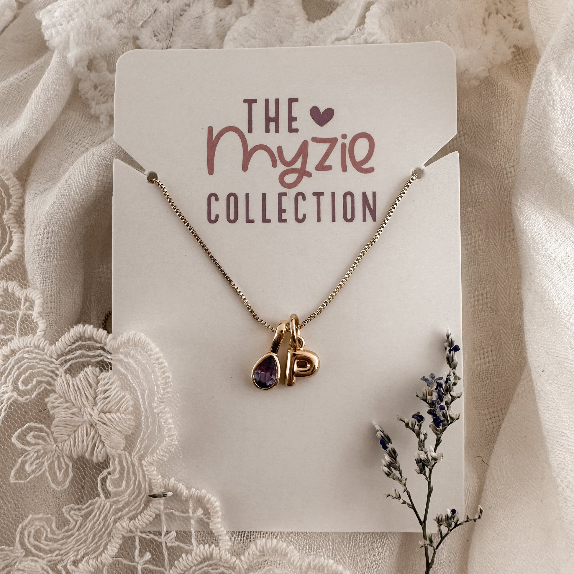 Birthstone + Bubble letter necklace / Myzie Collection