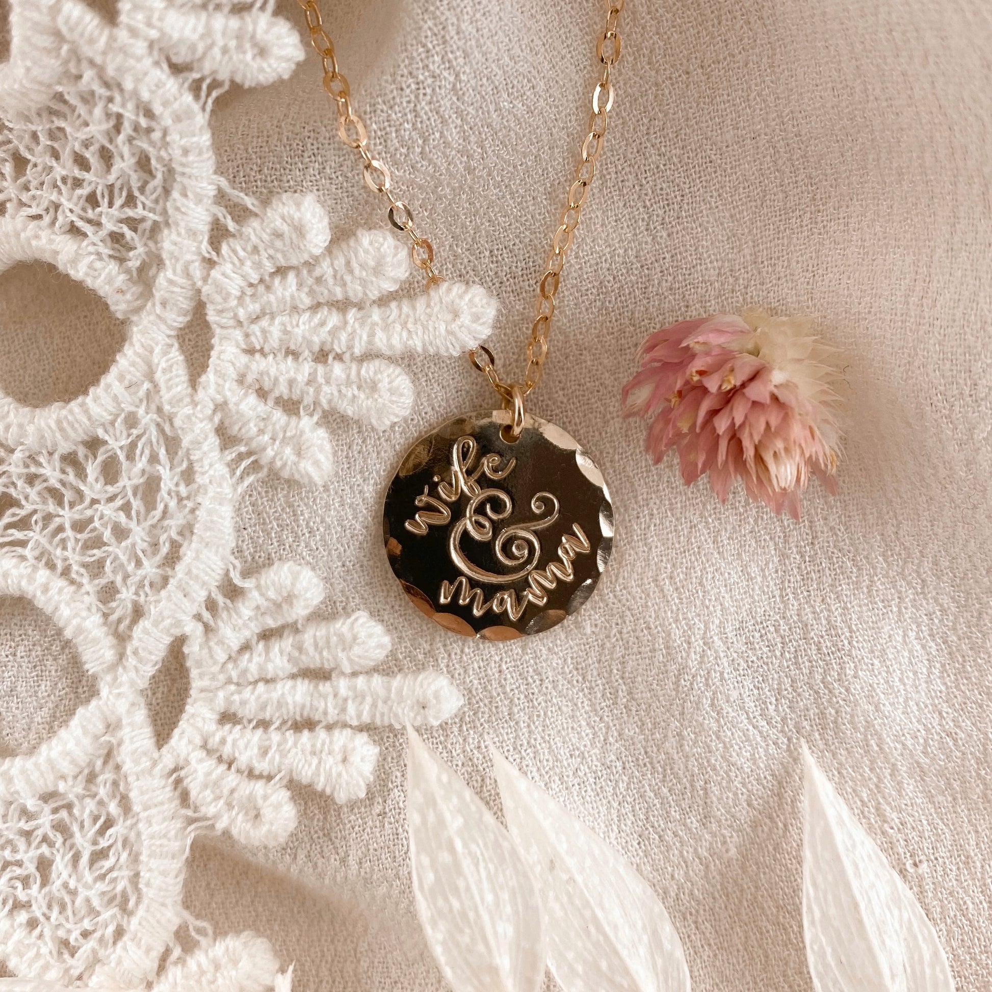 Hand stamped wife & mama. 5/8” gold filled disc with hammered edges.